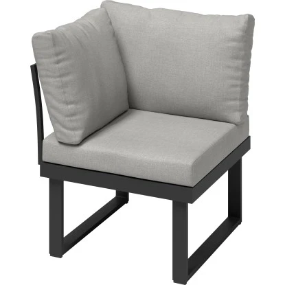 Der Alu-Ecksessel aus der Serie Lipson gefällt besonders durch sein stilvolles Aluminium-Design ein und lädt zum entspannten Zusammensitzen ein. Der Lounge-Stuhl wird durch das robuste pulverbeschichtete Aluminiumgestell in Anthrazit besonders stabil. Die bequemen Auflagen und Kissen in der Farbe Hellgrau sind gleich mitenthalten. Die Bezüge bestehen aus 100 % Polyester. Die 10 cm starke Füllung ist aus gesponnenem Polyester gefertigt.