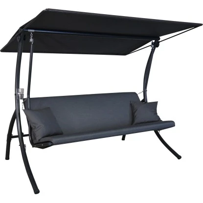 Die moderne Angerer Hollywoodschaukel Motion Zip ist mit wetterfesten Auflagen ausgestattet und bietet als 3-Sitzer viel Platz. Diese werden um den Sitz- und Lehnenrahmen gelegt und mit ReiĂverschlĂŒssen daran befestigt, sodass diese nicht verrutschen können. Die KissenbezĂŒge bestehen aus einem wetterfesten Polyacryl-Stoff und sind mit einem schnelltrocknenden Schaumstoffkern gefĂŒllt. Dank dieser speziellen Materialien können die Auflagen der Hollywoodschaukel Motion Zip auch bei schlechter Witterung und sogar bei Regen auf der Schaukel bleiben. Zwei passende Sofakissen sind ebenfalls im Lieferumgang enthalten. Das robuste Gestell der Hollywoodschaukel besteht aus verzinktem und pulverbeschichtetem Stahl. Das Sonnendach ist, aus wetterfestem Textilene Gewebe gefertigt und individuell verstellbar. Durch Vor- oder ZurĂŒckschieben oder Neigen des Daches ist stets optimaler Sonnenschutz gegeben. Ebenfalls verstellbar ist der Neigungswinkel der Lehne. Mit wenigen Handgriffen kann diese komplett zur LiegeflĂ€che abgeklappt werden. Der Sitz- und Lehnenrahmen besteht aus einem witterungsbestĂ€ndigen Kunststoff und ist bereits werksseitig vormontiert, sodass der Zusammenbau der Hollywoodschaukel kinderleicht ist.