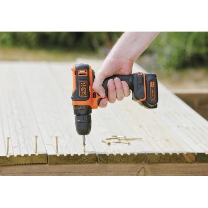 Der leistungsstarke Akku-Bohrschrauber BDCDD12KB von Black+Decker ist der ideale Helfer bei vielfältigen Bohr- und Schraubarbeiten in Holz und anderen Materialien. Das fortschrittliche Akku-Gerät bietet Ihnen dank kabellosem Betrieb maximale Bewegungsfreiheit beim Schrauben und Bohren und lässt sich jederzeit unabhängig von Stromquellen flexibel einsetzen. Ausgestattet ist der Akku-Bohrschrauber mit zwei hochwertigen Lithium-Ionen-Akkus mit einer Leistung von 10,8 V. Sie zeichnen sich durch ihre langlebigen und robusten Eigenschaften aus – kein Memory-Effekt, keine Selbstentladung – und weisen eine Kapazität von 1,5 Ah auf. Die integrierte Ladestandsanzeige ermöglicht Ihnen jederzeit die Überprüfung der verbleibenden Leistung. Mit dem im Set enthaltenen Ladegerät beträgt die Ladezeit der Akkus lediglich 4 Stunden.