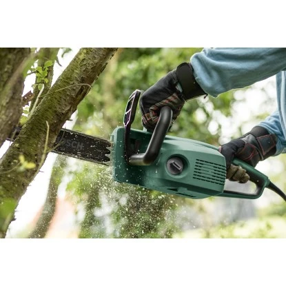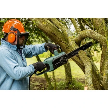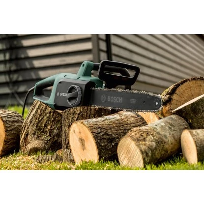 Die kabelgebundene Bosch Elektro-KettensĂ€ge UniversalChain 35 hat ein geringes Gewicht von nur 4,2 kg und ist ergonomisch fĂŒr optimalen Benutzerkomfort geformt. Ein leistungsstarker 1.800 W-Motor mit einer Kettengeschwindigkeit von 12 m/s sorgt fĂŒr schnelle Schnitte. Boschs kompaktes SDS-System ermöglicht ein werkzeugloses und einfaches Spannen und Warten der Kette. Dank eines groĂen, seitlich ausgerichteten ĂlbehĂ€lters mit gut zugĂ€nglichem Verschluss ist ein einfaches NachfĂŒllen des automatisch arbeitenden Kettenschmiersystems garantiert. Mit einer stabilen RĂŒckschlagbremse zum wirkungsvollen Stoppen der Kette ist fĂŒr die erforderliche Sicherheit gesorgt. Diese KettensĂ€ge ist leicht zu bedienen und zu bewegen und daher ideal zum SĂ€gen von BaumstĂ€mmen, dicken Ăsten und kleinen bis mittelgroĂen BĂ€umen.