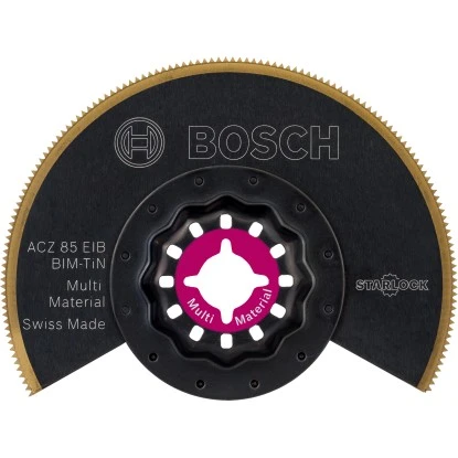Das Bosch Segmentsägeblatt ACZ 85 EIB für Multifunktionswerkzeuge Ø 85 mm eignet sich ideal für Tauchschnitte in Gipskarton- und Zementfaserplatten, in Holz, in ungehärtetes Metall, in kleinere Profile sowie in glasfaser- oder epoxidharzverstärkte Kunststoffe. Das mit Titan besetzte Blatt erreicht eine 30 % höhere Lebensdauer im Vergleich zu Bi-Metallblättern ohne Besatz und auch die mit Titannitrid besetzte, hoch hitze- und verschleißresistente Zahnleiste sorgt für eine überdurchschnittliche Nutzungsdauer. Die patentierte Rundschweißtechnologie der robusten und freistehenden Zähne ermöglicht Ihnen ein Arbeiten ohne Verklemmen und Hitzeschäden und auch schwer zugängliche Ecken können Sie mit den Sägeblattspitzen leicht erreichen. Das Profi-Aufnahmesystem für das Sägeblatt sorgt zudem für eine maximale Kraftübertragung zwischen Maschine und Blatt.