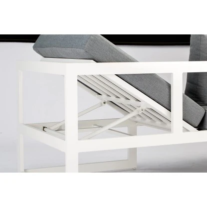 Die Lounge-Gruppe Rhodos in Weiß-Grau ist eine moderne Sitzgruppe mit weißem Gestell aus rostfreiem Aluminium und besteht aus einem 3-Sitzer, einem 2-Sitzer und einem Tisch. Mit dem mehrstufig verstellbaren Kopfelement des 3-Sitzers wird die Lounge im Handumdrehen zur äußerst komfortablen Liege. Die Polsterbezüge bestehen aus hautsympathischem Sensotex-Gewebe (100 % Polyester), sind mit einem Reißverschluss ausgestattet und können gewaschen werden. Zudem gehört ein praktischer Couch-Tisch mit Milchglas-Platte in modernem Design zum Lieferumfang dazu.