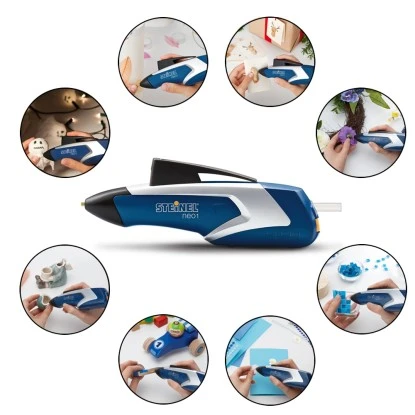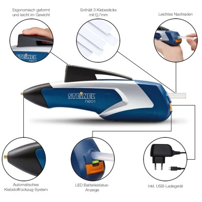 Mit dem besonders leichten und handlichen Steinel Akku-Heißklebestift Neo 1 ist kabelloses Arbeiten dank des Li-Ion Akkus möglich. Der Heißklebestift ist innerhalb von 15 Sekunden startklar, so können kleine Reparaturen im Haushalt oder auch Bastelarbeiten einfach und schnell erledigt werden.